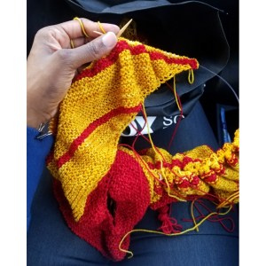 On arrival, I made my way to the rear door of the bus and my eyes became transfixed on a red and goldish project a woman pulled out her knitting bag. Then began a Q & A like no other. What was she making? What brand of yarn was she using? How long had she been knitting the project? What yarn store does she frequent? Where is Hidden Rivers Yarn? How easy is it to get there? This woman graciously answered all my questions and have me a brief overview of your back story. Yet I didn’t have time to ask her name before exiting the bus and embarking on an impromptu mini shopping spree. Later, I would find out the woman’s name is Anjeanette,