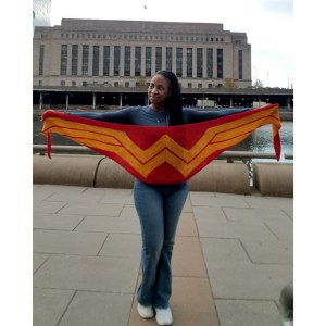 So because I’m getting to post this so late in the month I have already knitted the wrap and I got to meet up with Anjeanette to make sure I was on the right track. I completed the Wonder Woman Wrap in 7 days as a commuter project, stressed my eyes and my knitting community while doing it.